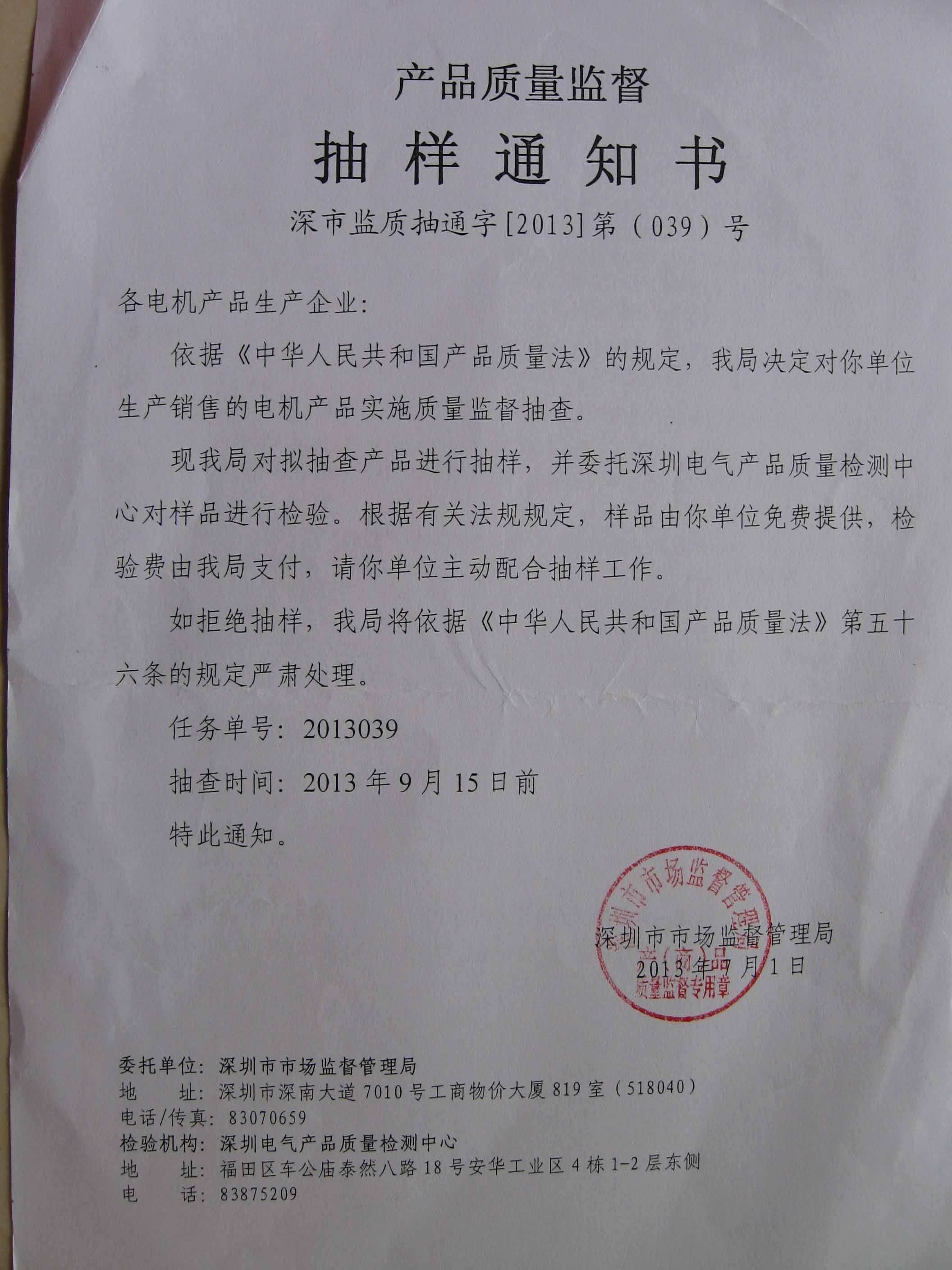 我司產(chǎn)品連續(xù)2年被深圳市質(zhì)量技術(shù)監(jiān)督局抽檢合格